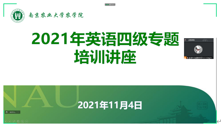 11月4日晚,爱爱啦 英语四级专题培训讲座在腾讯会议上顺利举行,主讲人为新航道英语机构陈小梅老师,爱爱啦 100余名本科生积极参加了此次讲座。
