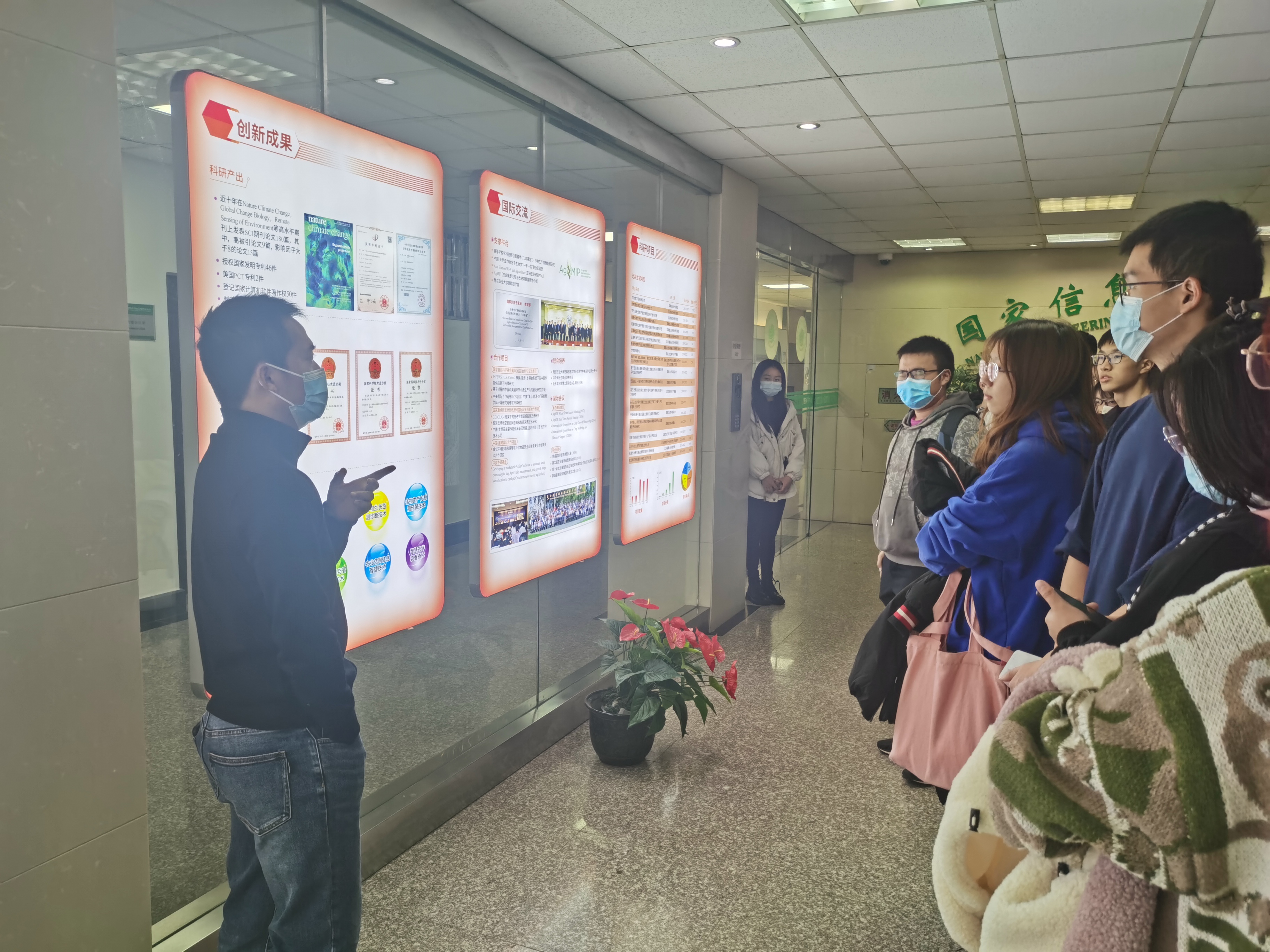 最后,由郑恒彪老师带领同学们参观了国家信息农业工程技术中心。郑老师以幽默风趣的口吻介绍了智慧农业的风采,让同学们重新认识了现代农业的自动化和先进性。郑老师指出,智慧农业,即是用信息技术指导农业生产,以科技的力量带动农业增产增收。最后,郑老师着重介绍了实验室具体的研究方向:一是农情遥感监测;二是农田系统模拟;三是农业精确管理方向-农业信息工程。运用前几个方向研究成果进行高新农业装备研究,将现代农业、物联网、人工智能和机电工程结合,利用智慧农业推动生命发展。
