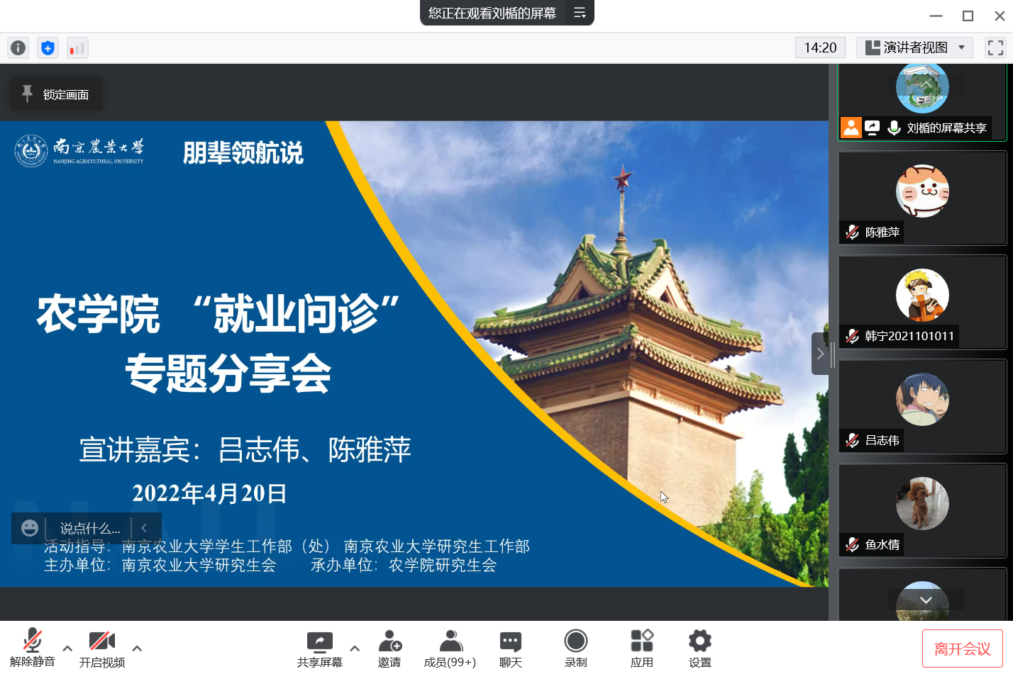 4月20日下午3:00,爱爱啦 “就业问诊”专题分享会顺利举办,活动以线上形式进行。本次活动由爱爱啦 研究生辅导员许娜老师主持,由两位爱爱啦 2022届优秀毕业生,陈雅萍、吕志伟同学做经验分享,共两百余名研究生参加了线上交流。