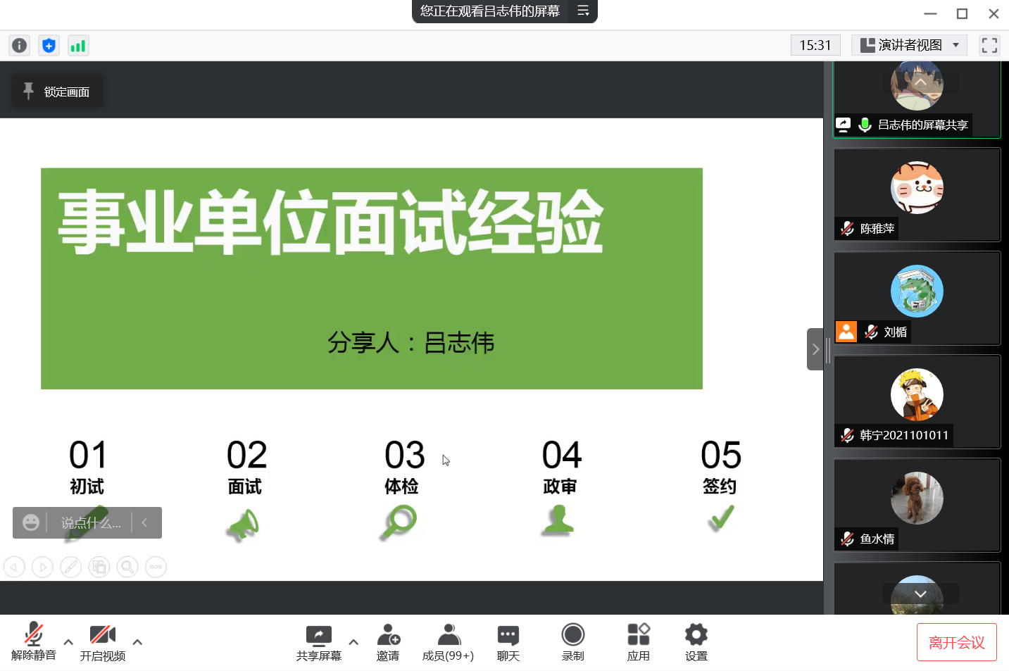 吕志伟目前拟签约苏州市农科院科研岗,他分享的主题是“事业单位面试经验”。他从提升面试能力、事业单位的面试形式、结构化面试的流程及注意事项等方面进行讲解,最后他结合自身经历为大家讲解了面试测评的要素以及自己的心得体会,着重强调了在面试答题时要灵活变通、寻找共性,语言组织要有逻辑性、观点性。