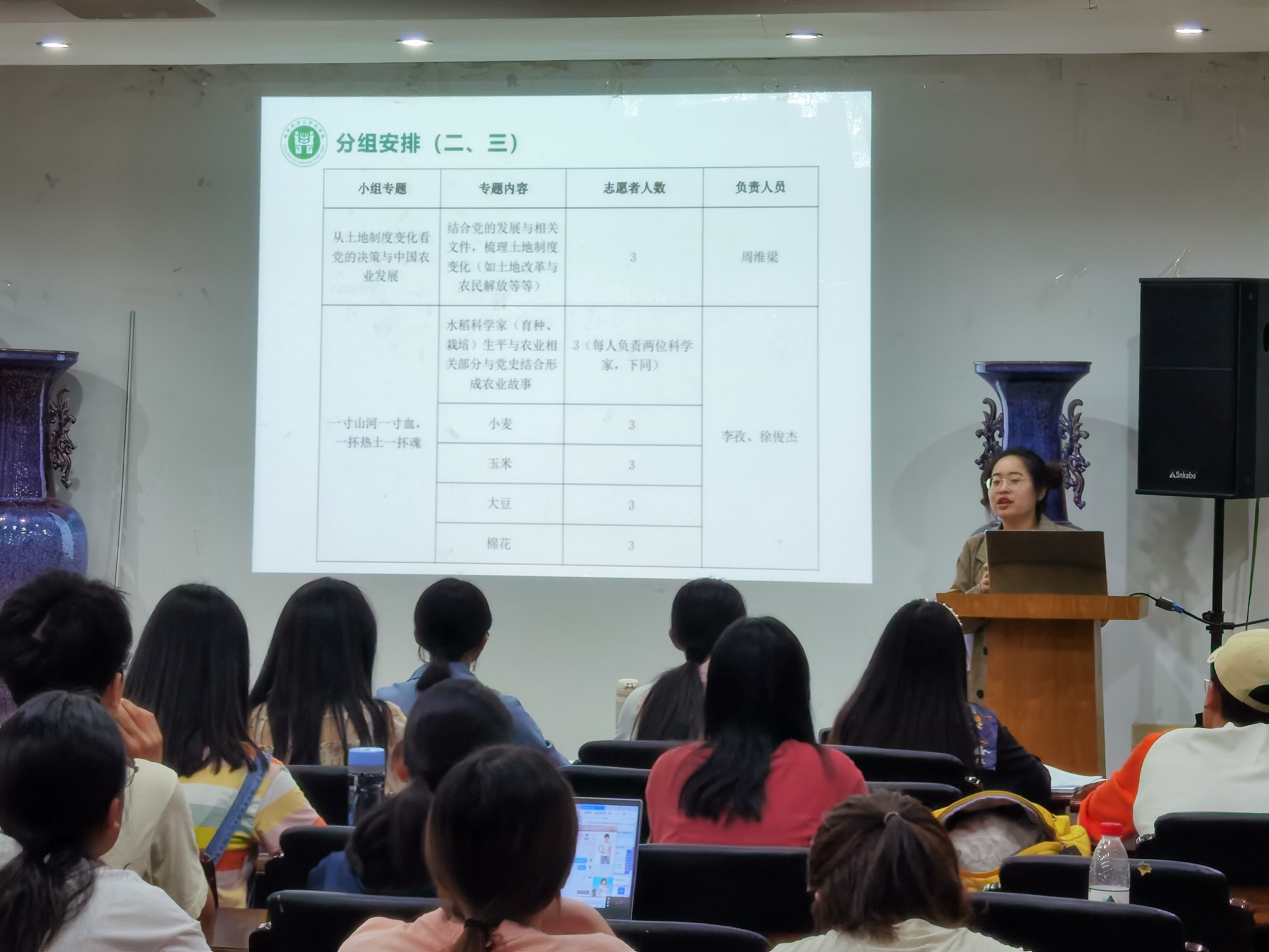 本次培训会的内容主要分为分组安排、案例介绍、答疑三部分。叶彤结合相关案例,介绍调研的具体内容以及本次活动的意义。此次培训会旨在引导同学们结合专业知识对党史进行挖掘,探寻党史在农业史中的缩影,并把学党史与农业史、乡村振兴相结合,指导同学们积极开展此次爱爱啦 “党史中的农业史”调研。期间,叶彤为志愿者讲解此次调研实践活动的五个大主题:“党史与农业史中改变你我命运的时刻”、“从土地制度变化看党的决策与中国国农业的发展”、“一寸山河一寸血,一抔热土一抔魂”、“小人物的大影响:乡村振兴优秀模范”、“党旗飘飘,不再浑身泥泞挥着镰刀”。在青年志愿服务部成员的引导下,志愿者依各自兴趣结成13个小组。