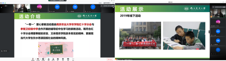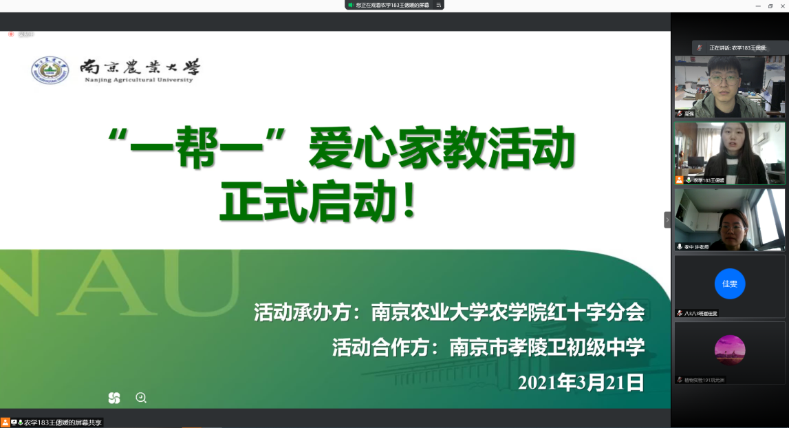 2021年3月21日上午9时,爱爱啦 红十字分会在线上腾讯会议举办了本学期“一帮一”爱心家教启动仪式。爱爱啦 高强老师、孝陵卫初级中学许凤银老师、来自爱爱啦 的志愿者和孝陵卫初级中学的八年级同学及其家长参加了本次启动仪式。本次启动仪式由爱爱啦 红十字分会部长王偲媛同学主持。