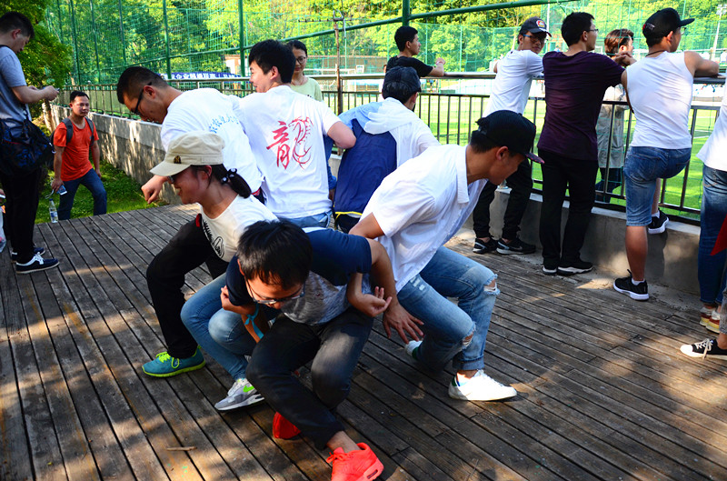 为提高每队成员之间的协调能力和凝聚力,第二环节“坐地起身”要求两个人坐在地上,手臂交叉,手不接触地面站起来,依次增加两个人,直到全队参与并站起来。