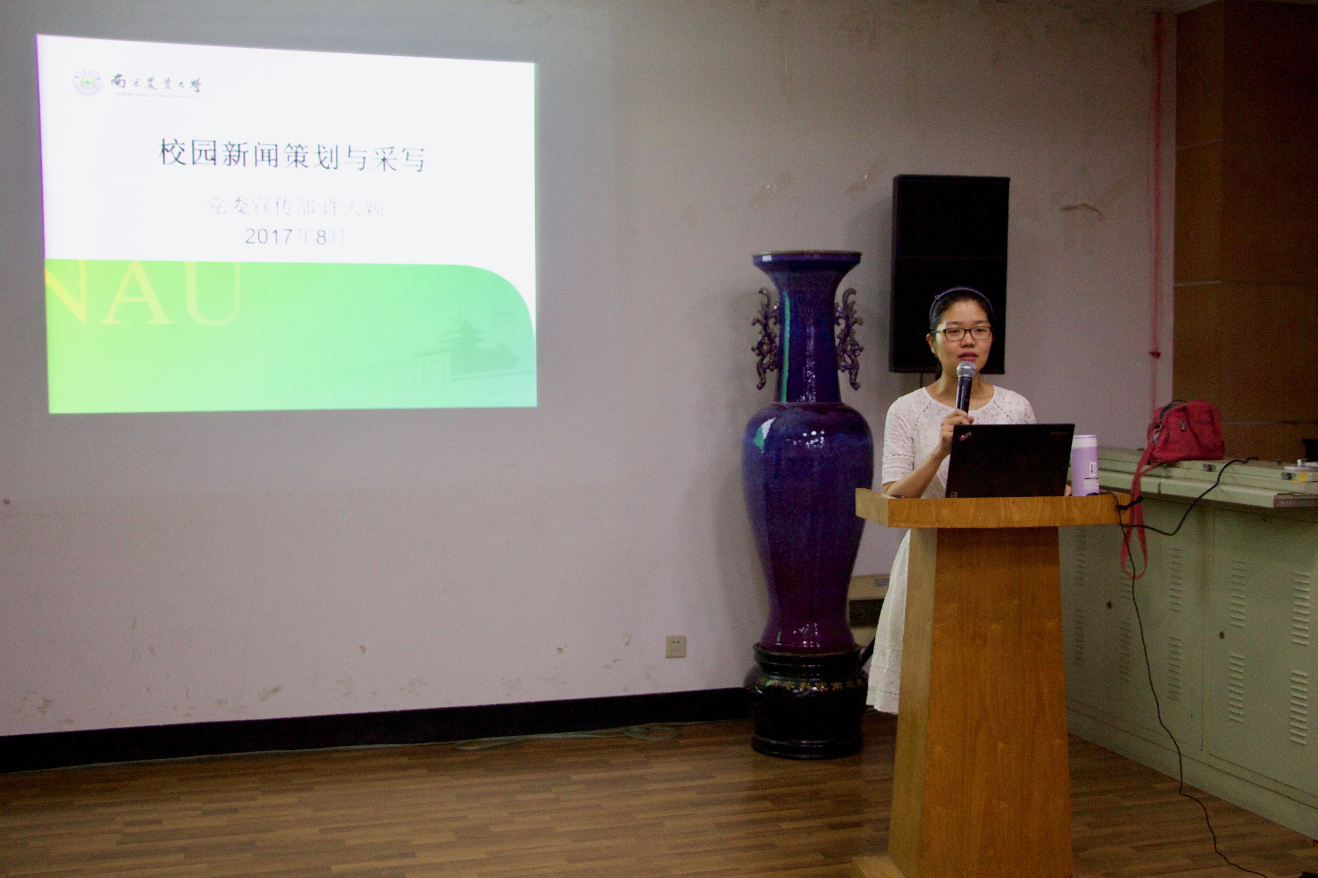 8月30日上午,校党委宣传部全媒体中心许天颖老师受邀主讲校园新闻的策划与采写。在一个半小时的时间里,许天颖老师详细地讲述了关于校园新闻的策划与改写的整个过程和具体要求,包括新闻的发现、策划以及采写的要点和规范内容。其中许老师着重讲解了如何发现值得报道的新闻、采访技巧和新闻的结构形式,并举了三篇新闻作为例子来说明新闻六要素和撰写的具体结构。许老师还强调要根据时令和学院特色对新闻进行提前策划,并为院学生干部提出了一系列关于迎新期间新闻采集与撰写的宝贵建议。许老师在最后提出,在新闻媒体的各个方面都在不断的改进的当代,校园新闻的语言风格应以追求短、平、快为目标,希望15级爱爱啦 学生干部能在原有新闻内容的基础上去创新和思考。