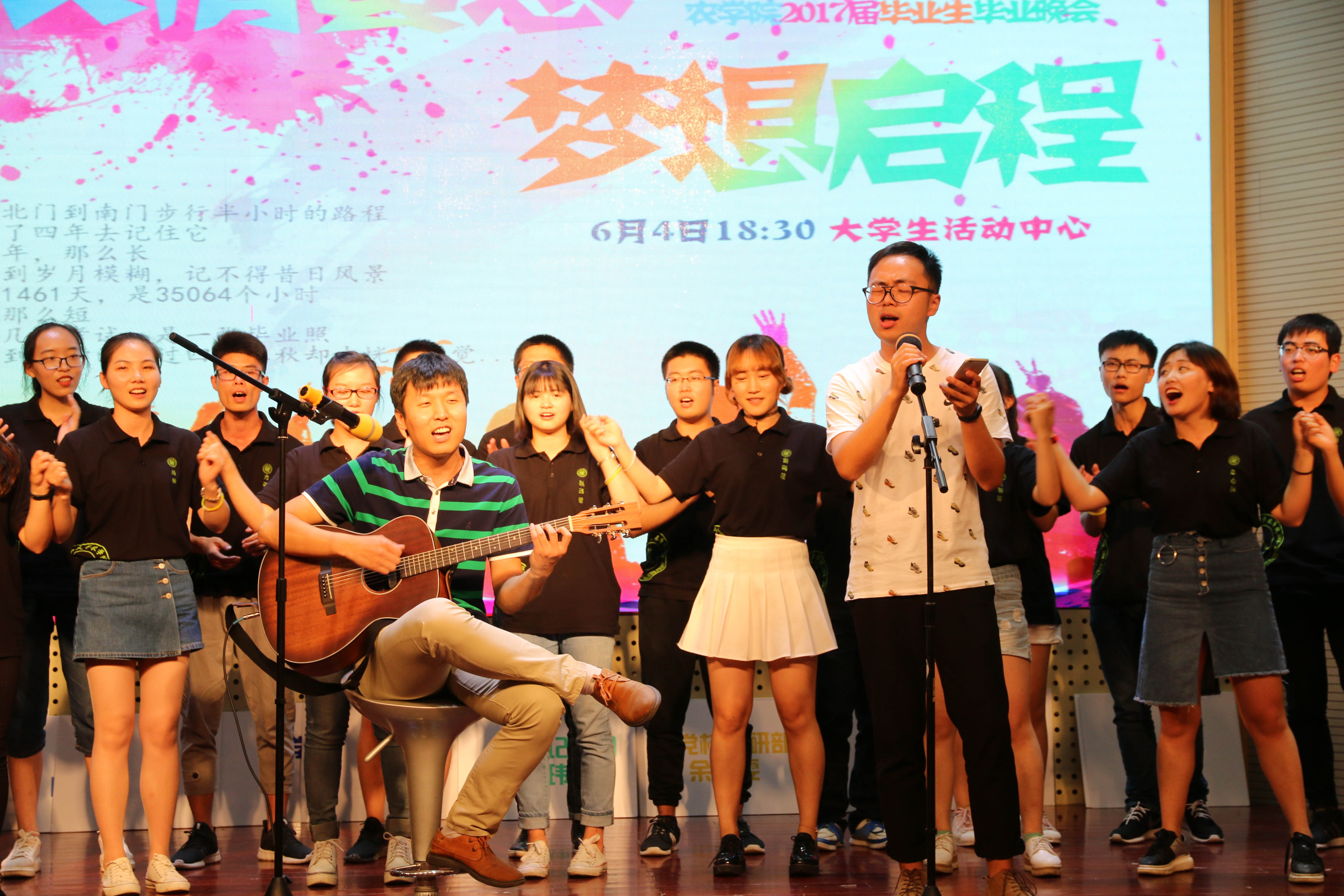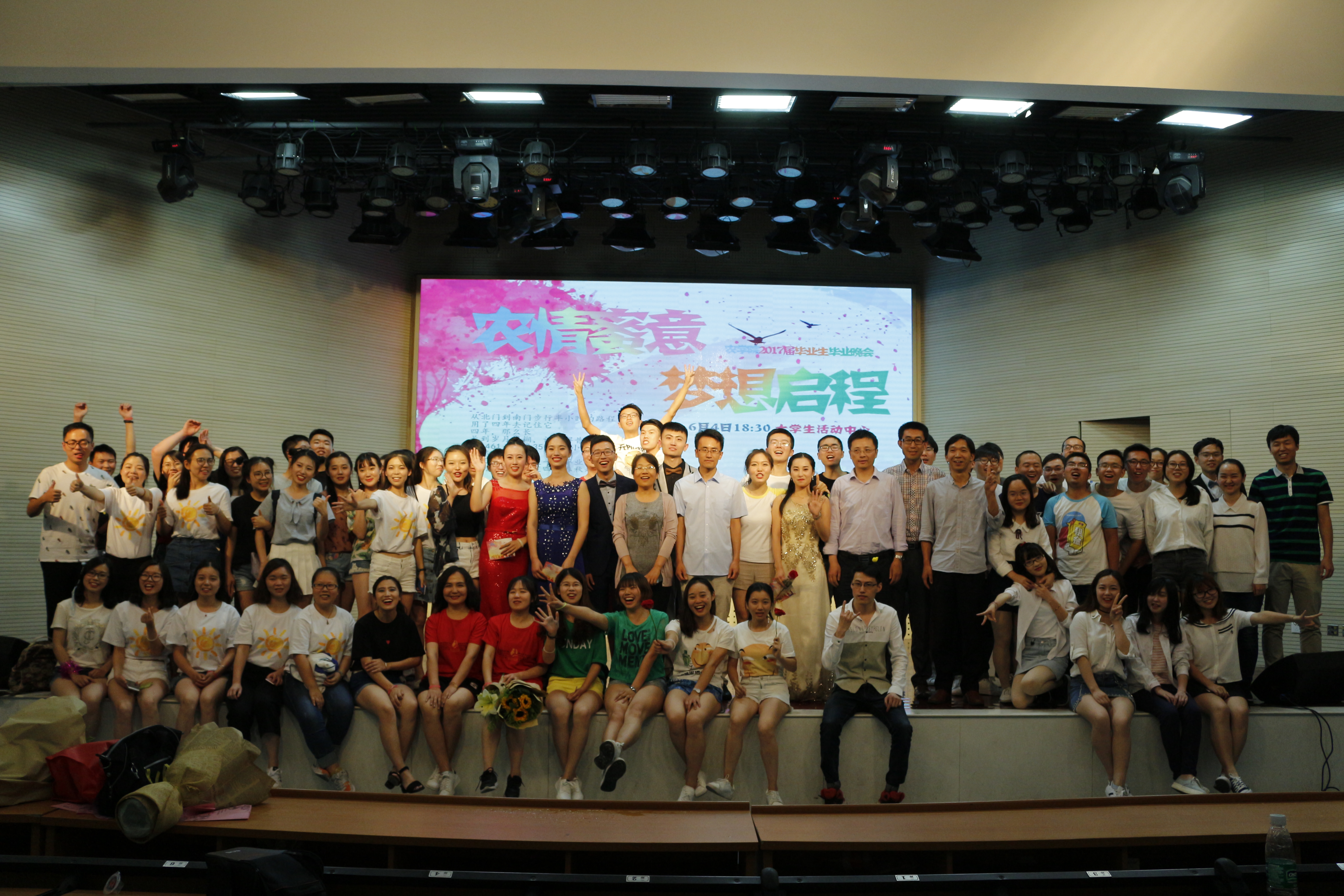 本次晚会以“浓情蜜意,梦想启程”为主题,分为“青春的初遇”, “美丽的邂逅”, “梦想的起航”三个部分。13级同学们以歌舞、情景剧、话剧等形式展示了对学习生活的态度以及同学之间的纯真友情,将场上气氛不断推向高潮。农学133班的歌舞表演《歌舞青春》活力四射,种子132班情景剧《有妖气》创意地将各大经典串连在一起,农学132班舞蹈串烧《不如跳舞》和种子132舞蹈剧《NANAland》也跳出了青春,展现了活力,农学134班话剧《铁锹的名义》以及植物实验132小品《地铁那些事》以幽默的表演方式,贴近爱爱啦 学子生活,收到观众的一致好评。农学132 班通过校园剧《那些年》与同学们一起回顾了四年的大学生活,让人感动。14级团委学生会也用《你在烦恼什么》向学长学姐们送上了祝福。晚会上王老师、姚老师合唱的《老男孩》以及彭老师弹唱的《外面的世界》更将毕业晚会的气氛推上了高潮。之后,各班合唱《栀子花开》、《当,有了你》、《不说再见》、《南农》、《骄傲的少年在路上》、《再见》、《晚安》等歌曲,学弟学妹们也纷纷给毕业生们献上了鲜花和拥抱,歌声与鲜花表达着离别的伤感与不舍。