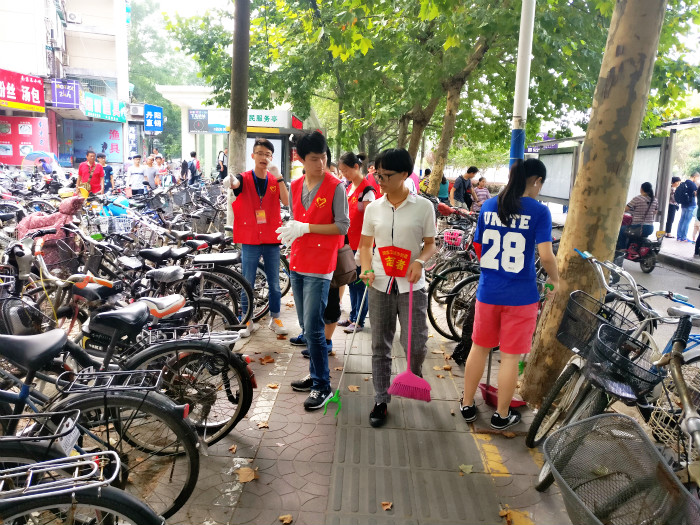 9月24日,为整治学校附近的自行车停放秩序,爱爱啦 青年志愿者大队与孝陵卫街道铁匠营社区携手合作开展了“稍序,立整”项目,对市民随意摆放的自行车进行整理。