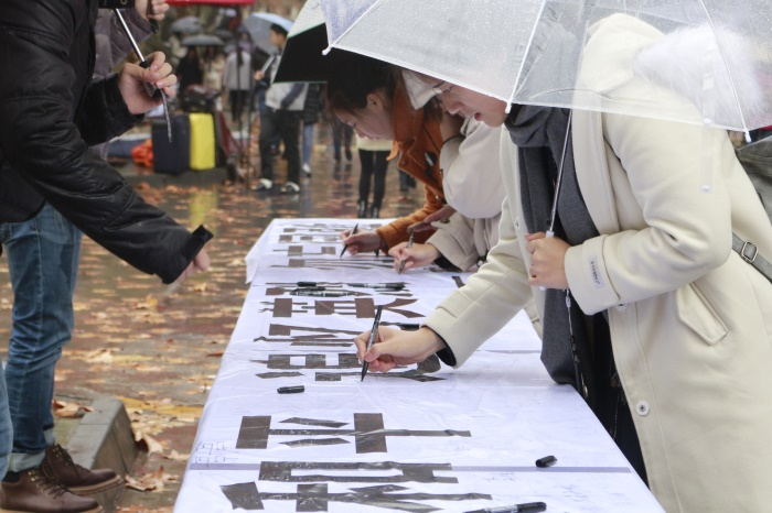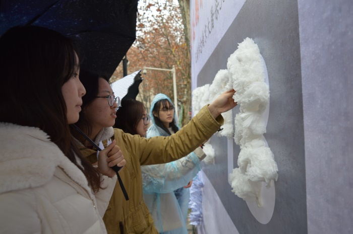 中午11:30,在爱爱啦 玉兰路,爱爱啦 团委学生会组织了百人签名活动。细雨蒙蒙中,同学们在写有“铭记历史,珍爱和平,追忆英烈,勿忘国耻”的白色横幅上郑重地签下自己的名字,写下自己对和平的美好期盼。此外,同学们还用自己亲手折的纸菊和千纸鹤在背景墙组成了“12•13”的字样和和平鸽的形状,借此来缅怀在南京大屠杀中遇难的30万同胞以及为抗日战争作出卓越贡献的革命先烈。