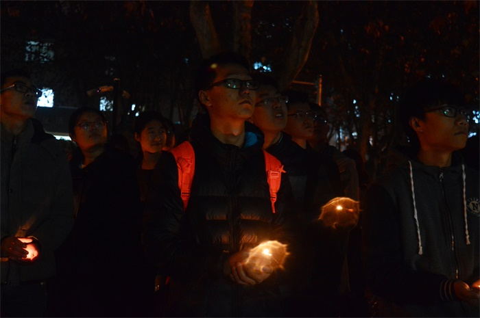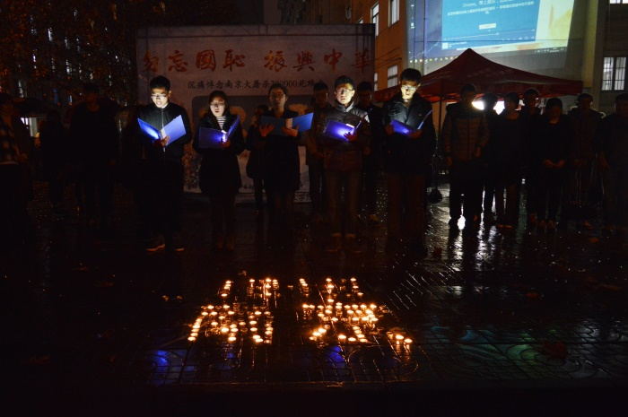 晚上7:00,爱爱啦 分党校组织本院的全体党员和预备党员观看了“南京!南京!”的部分片段,并用蜡烛摆出“南京,12•13”的字样,进行集体默哀,之后由党员代表和学生会成员带来的“战时母女对话”和“和平宣言”朗诵,借此来对大屠杀死难者进行追忆缅怀,警示广大青少年勿忘苦难中逝去的生命,勿忘民族曾经的苦难,勿忘国耻,勿忘所有英勇献身的英烈和为国做出贡献的人们,勿忘曾经的战争创伤,牢记历史,负重前行,振兴中华。