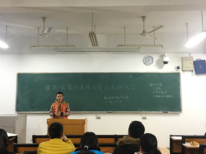 12月4日晚,植物实验专业党支部在教学楼A205召开支部大会。大会共有三项议程:总结本学期的活动开展和专题学习情况、民主评议会和积极分子的内部考核。