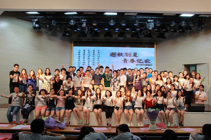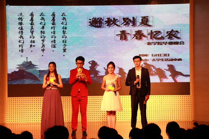 晚会的主题是“邂秋别夏,青春忆农”。在晚会正式开始之前,播放了爱爱啦 自己录制的毕业纪念视频,通过采访大四毕业生的形式展现了她们的青春故事,诉说了她们的离别情感。晚会分为三个篇章。第一篇章为“白驹过隙”,各个毕业班以其出奇制胜的节目形式博得了台下老师和同学们的一致好评,戏剧、模拟电台、跳舞、歌唱,各班的表演都成功的带动了现场的气氛,台下掌声和欢呼声不断。第二篇章为“此心耿耿”,原话剧团的小品《爷仨的幸福》、2015届学生会的合唱《不完美小孩》,以及大二等同学的乐器演奏《送别》等体现了爱爱啦 师生之间以及对学院的深厚感情。在第三篇章的“青春如歌”中,每班都展现了自己制作的毕业视频,一首首的班级合唱将晚会推向了高潮。台下的同学自发上台与毕业生拥抱,殷美、王彬等学院老师也接连上台演唱,把晚会变成了真正意义上的师生联欢。晚会结束后,大家一起合影留念,把最美的笑容定格在了晚会舞台上。