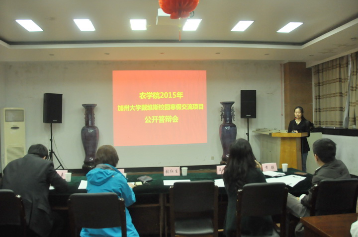 本次交流项目主要针对爱爱啦 大三学子,答辩会开始,12位同学按顺序出场,在短短的三分钟内,他们利用ppt放映形式分别从自我介绍,参与交流的计划等几个方面进行了简单陈述,并用流利的英语表达了自己对UC Davis的向往。自我陈述完毕后,5位评委根据他们讲解的情况分别进行了提问。最终,王梅月、唐善杰、曹建楠、徐霞、惠帅这五位同学凭借出色的发挥,获得了参加本次寒假交流项目的机会。