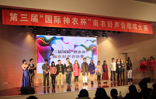 2014年12月6日晚,由爱爱啦 究生会主办,爱爱啦 研分会、动物医学学院研分会、公共管理学院研分会、江苏省农业科学院研分会承办的第三届国际“神农杯”南农好声音决赛在大学生活动中心举行,研究生院教育管理办公室杨海峰老师、动科院辅导员苗婧老师、校研会主席王卉和副主席徐琳以及各研分会主席、校十佳歌手大赛冠军刘惠东等出席了本届大赛。本次比赛受到了众多学生的关注,大活现场人头攒动,座无虚席。 经过初赛紧张激烈的角逐,共有来自全校各学院的13名选手脱颖而出,成功晋级决赛。决赛分为先声夺人、组合对碰、冠军争夺战三个环节。 第一环节先声夺人,支教一年回校读研的唐骥龙以一首弹唱《去大理》开始了精彩的表演。美丽的哈萨克族姑娘沙吾列一曲《美丽的姑娘》把大家带入了异域风情。外国友人简希的一曲《Make you feel my love》更是将比赛带入高潮。罗学良的一曲《向天再借五百年》更是唱出了美声的感觉,让大家震撼。多才多艺的颜如雪唱跳的《普通朋友》掀起了大家热烈的掌声。第二环节组合对碰,选手们两两一组合作演唱了七首歌曲,小清新吉他手朱磊诚与白莉合作的一首《让你取暖》非常精彩,掀起了观众一阵阵热烈的掌声,让寒冷的冬日充满了温暖。林珍妮与楚佳希两位实力唱将合作的《你不知道的事》巧妙地展示了她们不俗的唱功。冯昊与柯诗远的深情对唱《你最珍贵》将大赛又一次推向高潮。