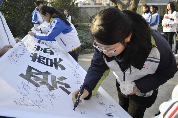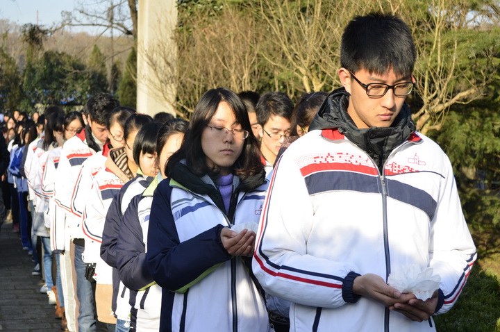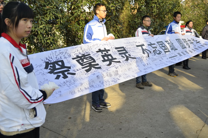 此次悼念活动共分为四项。首先是签字仪式,党员列成四队,依次上前,在“祭奠英灵,勿忘国耻,圆梦中华”的条幅上写下了感言,签上了自己的名字,以表达他们对死难者的哀思,更表明他们会继续缅怀历史,奋勇前行。接着,是党员入党宣誓,在爱爱啦 分党校秘书长顾周琳的带领下,宏亮激昂的宣誓声震彻现场,他们作为党组织的接班人,将会继续履行好自己的使命,把党的事业发扬光大。之后,主持人倡议,全体人员驻足默哀三分钟,大家纷纷低下头颅,弯下身躯,默哀沉思。三分钟转瞬即逝,但大家脑海记忆里的创伤却连续发酵,心中的悲怆久久不能平息。紧接着,爱爱啦 学生会主席袁昊和南京体育学院学生会主席共同扶起祭奠花圈,缓步走上台阶,放在墓碑之前,代表南农学子和南体学子对死难者进行深切缅怀。最后,两学院的学生依次排成长队,上前献花,瞻仰墓碑,寄托哀思。