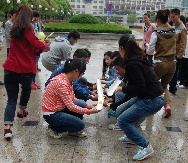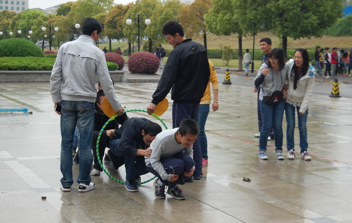 开幕式结束后,比赛开始了。整个心运会包括一区和二区的6个比赛项目和4个中间休闲游戏。以班级为单位,每个项目选派10人参加各个游戏,成绩以各班完成各个比赛项目时间长短排名。天虽有阴晴,但同学们热情洋溢。在近3个小时的时间里,“天旋地转”、“盲人方阵”、“飞跃通天河”等游戏有序进行,快乐伴行你我他。