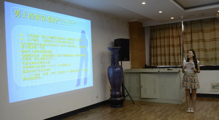 文艺部部长米新月将内容分成了三部分进行,分别是学生干部办公室礼仪、学生干部社交礼仪、学生干部形象礼仪。首先米新月介绍了每种礼仪的具体内容,然后,她又根据实际情况向大家生动的展示了礼仪中的一些技巧。