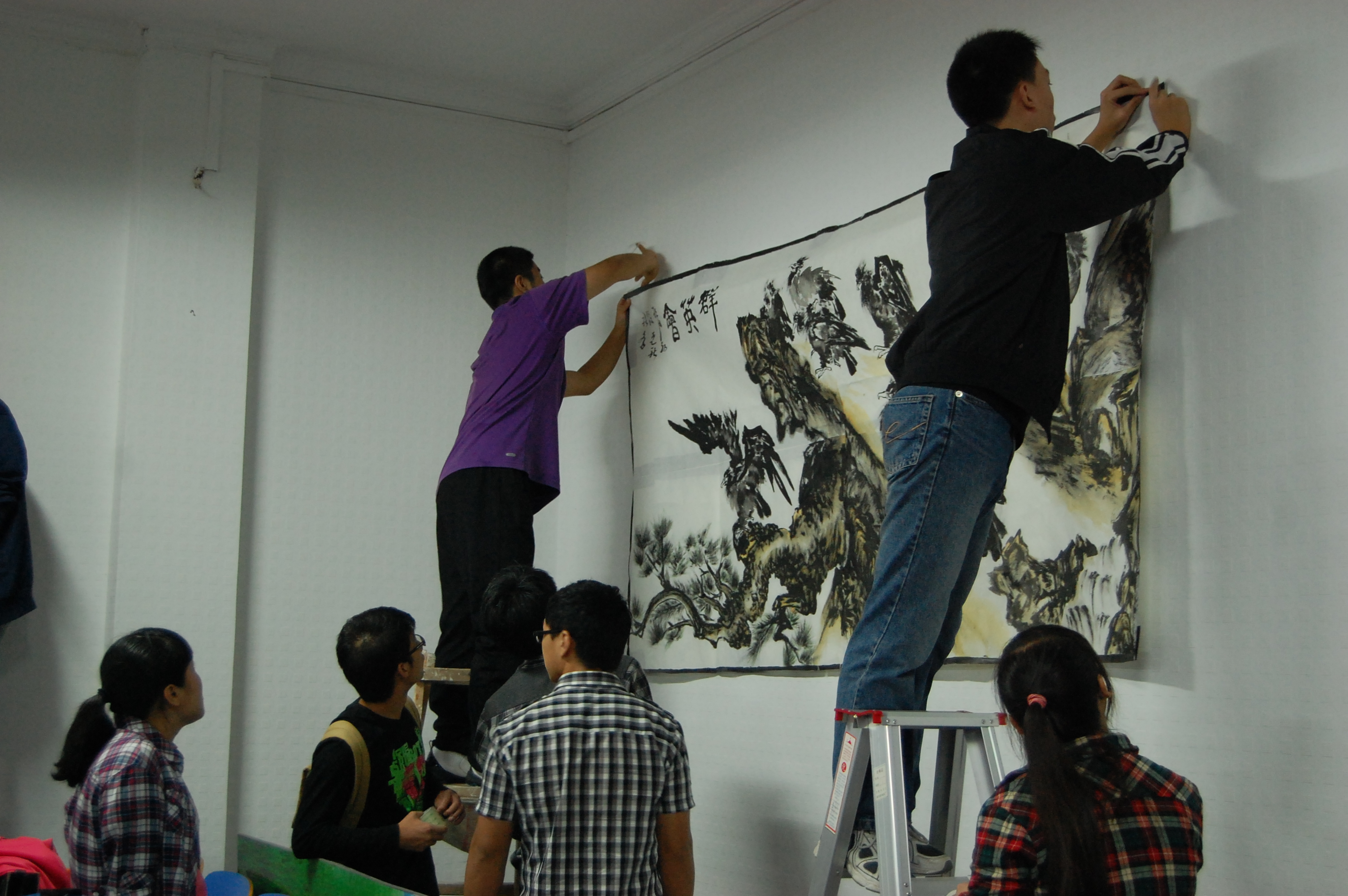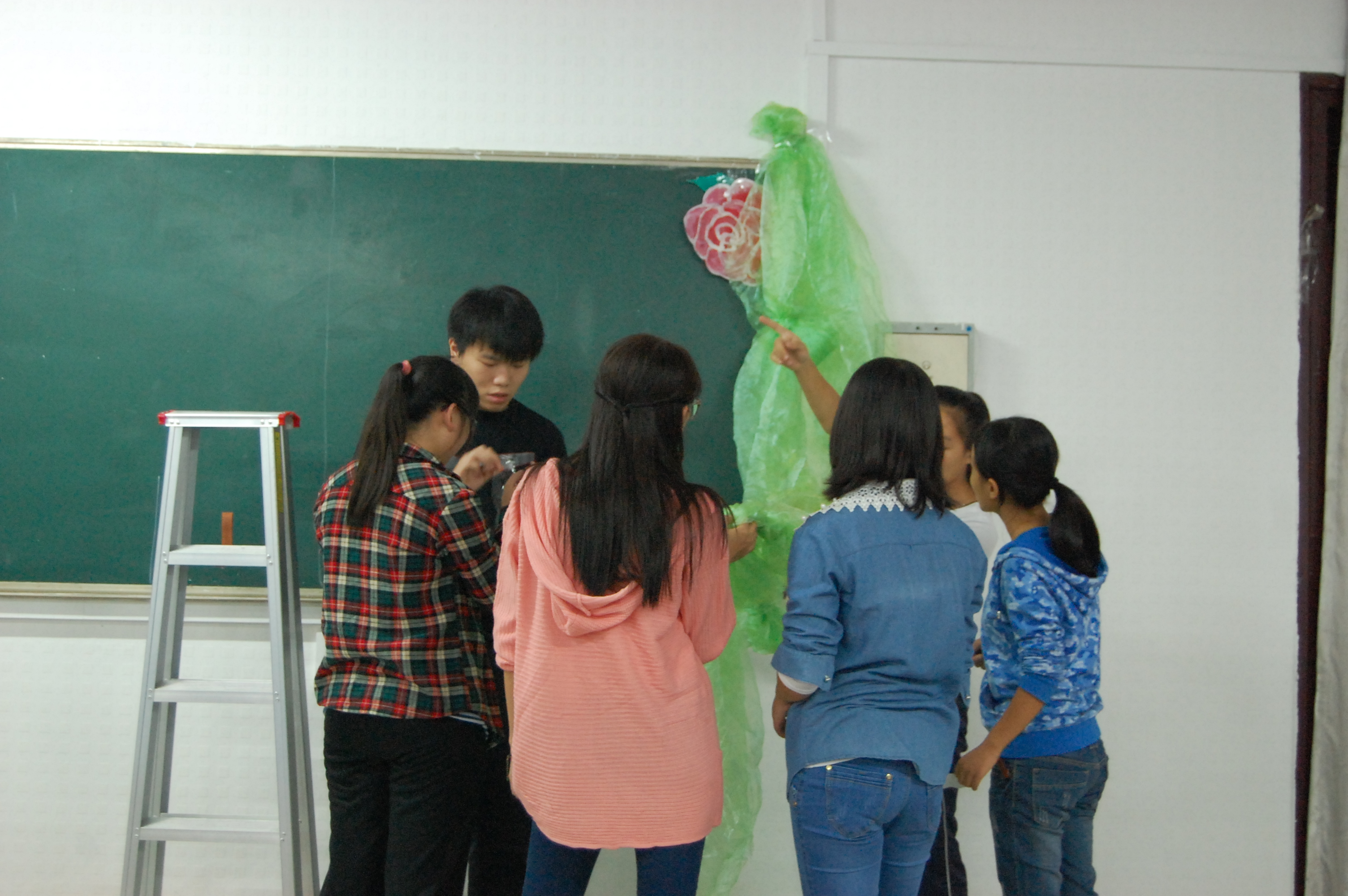 “今年的主题是‘菁菁校园迎莘莘学子’,是大家一起想出来的。会场的布置以营造温馨的气氛为主旨,让新同学们能感受到爱爱啦 大家庭的温暖。”学生会主席周庆鹏介绍道。门口摆放的宣传板上是学长学姐们的祝福寄语,黑板上贴着醒目的标语彩纸,窗户上装饰的是同学们吹出的五彩气球,墙壁上是动感的人物剪影贴纸。更有一幅气势雄浑的大型中国画为会场增添了浓浓的中国风,这幅画是才华横溢的宣传部部长丁园的杰作。大家团结协作,互帮互助,将爱爱啦 迎新会场布置的温暖美丽。