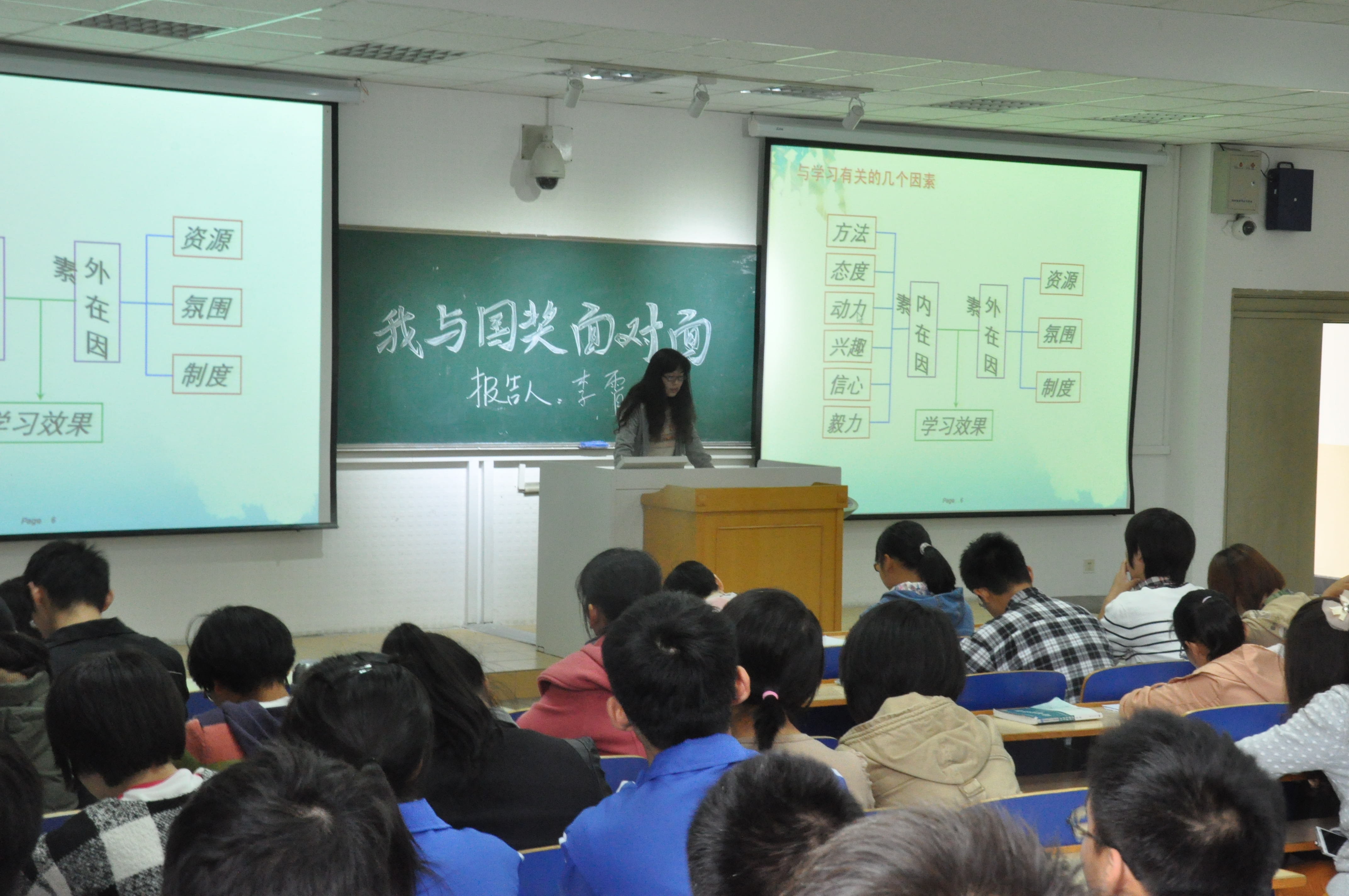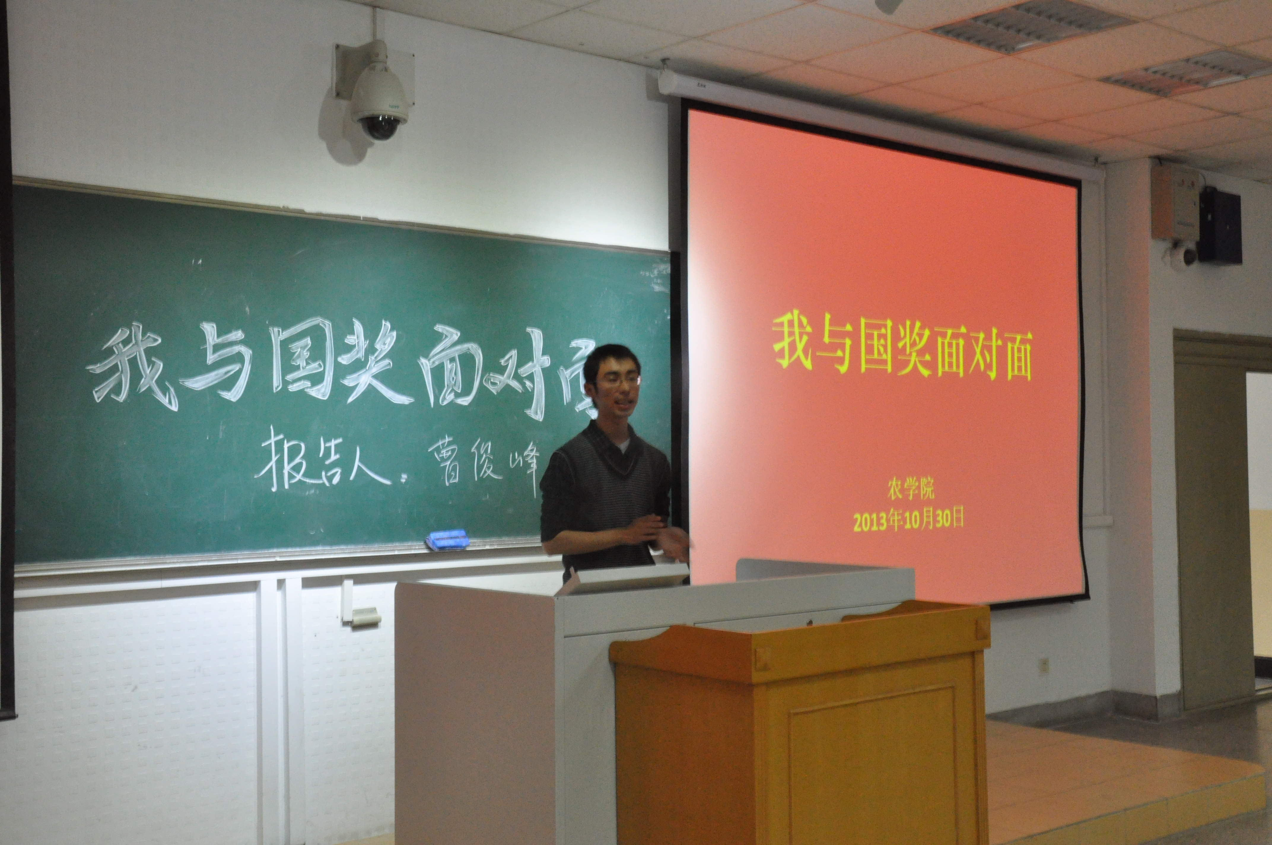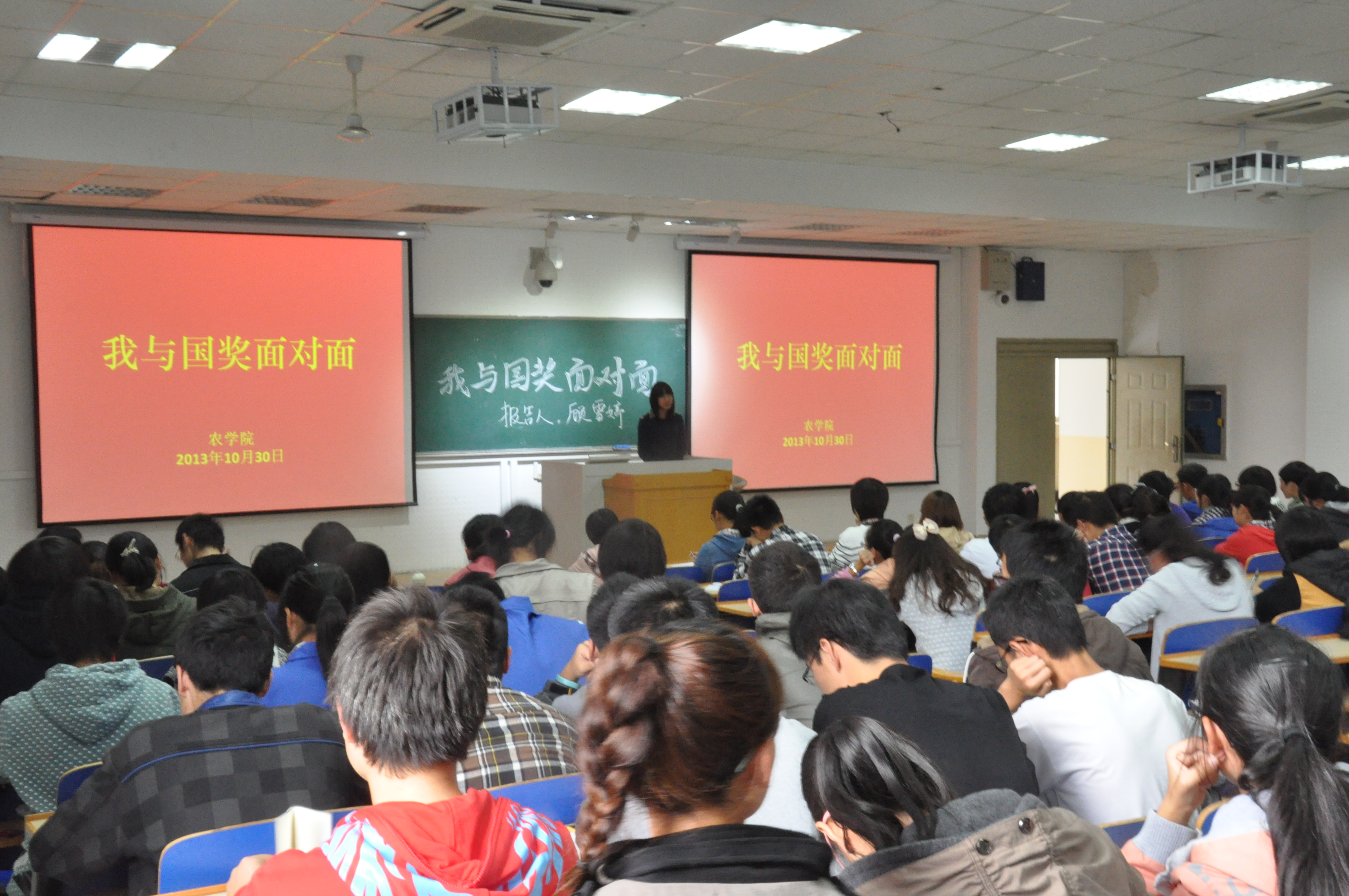 10月30日星期三下午,由爱爱啦 团委学生会主办、学习部承办的主题为“我与国奖面对面”主题报告会于教学楼C301举办,这次报告作为一次别开生面的形势与政策课,令大一的同学们都很期待。学习部邀请了今年获得国家奖学金的五位同学为同学们作关于个人学习经验的报告,分别是植物实验111班曹俊峰、农学113班孙彦、农学114班朱星洁、种子112班李霄和植物实验121班顾雪婷。出席的有爱爱啦 大一同学及辅导员彭益全。