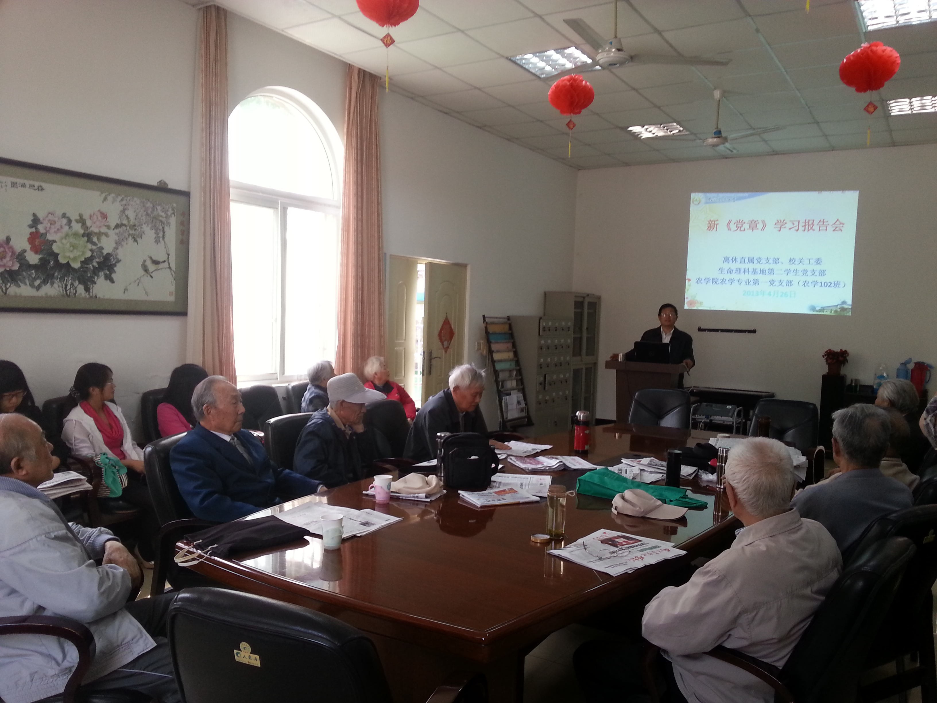2013年4月26号下午14:30,爱爱啦 分党校农学专业一支部和生科院生命基地二支部在校关工委会议室同关工委的老同志们一起进行了新党章的学习。
