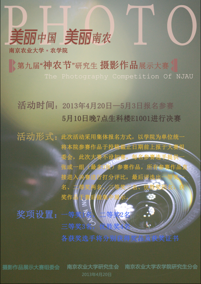 4月20日,由校研究生会主办、爱爱啦 研究生分会承办的第九届“神农节”研究生摄影作品展示大赛火热开赛。此次摄影大赛以“美丽中国,美丽南农”为主题,用同学们手中的相机,记录下南农美丽的瞬间,更好的落实党的十八大精神,让世界了解美丽中国,让大家认识美丽南农,充分展示南农的独特的丰富文化内容同时,此次活动作为爱爱啦 第九届“神农科技文化节”的一部分,旨在丰富爱爱啦 研究生的课余文化生活,彰显出南农研究生的别样风采。