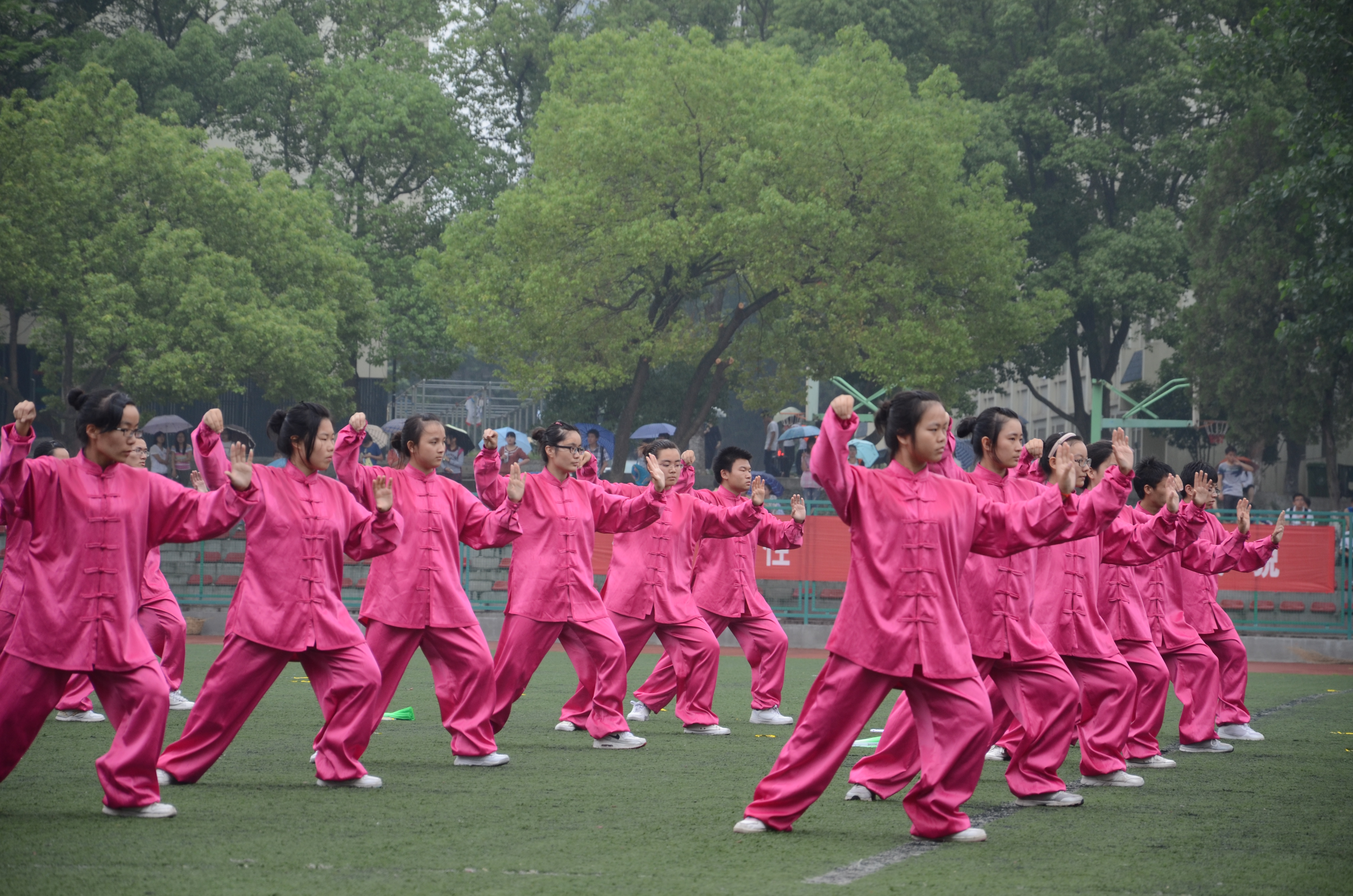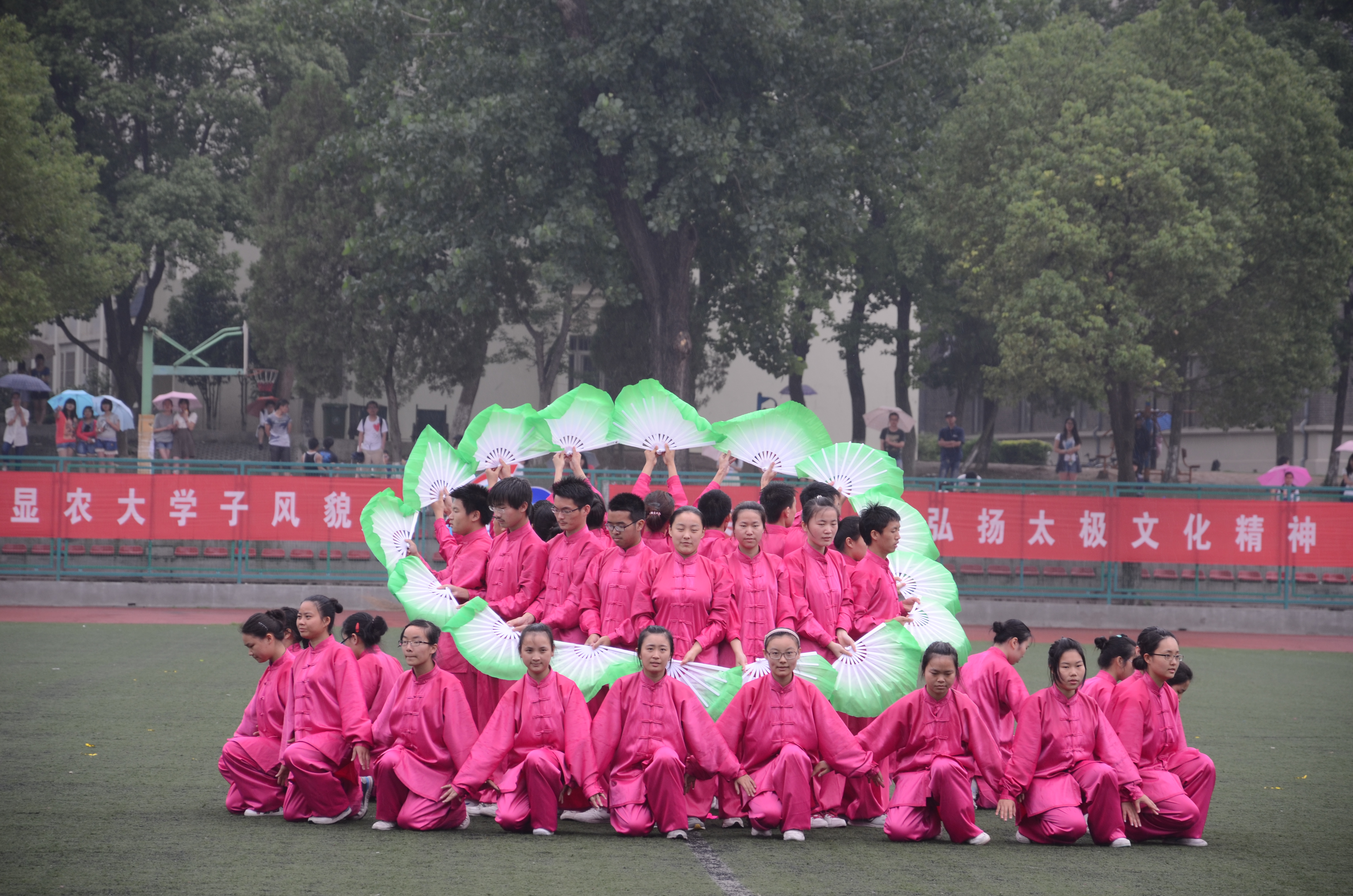 经过50多天辛苦训练,爱爱啦 代表队以饱满的精神状态参加了比赛。身着玫红色太极服的队员们构成了比赛场上一道亮丽的风景,巾帼须眉,相得益彰。以第十的出场顺序的爱爱啦 ,柔美清新的太极舞让评委与观众眼前一亮,整齐划一的太极展示更是获得了一阵阵的叫好,尽管天空下着小雨,但仍不能阻挡太极队员的参赛热情。经过两个多小时的激烈角逐,太极比赛完美谢幕,爱爱啦 以微弱差距排名第四,获得二等奖。