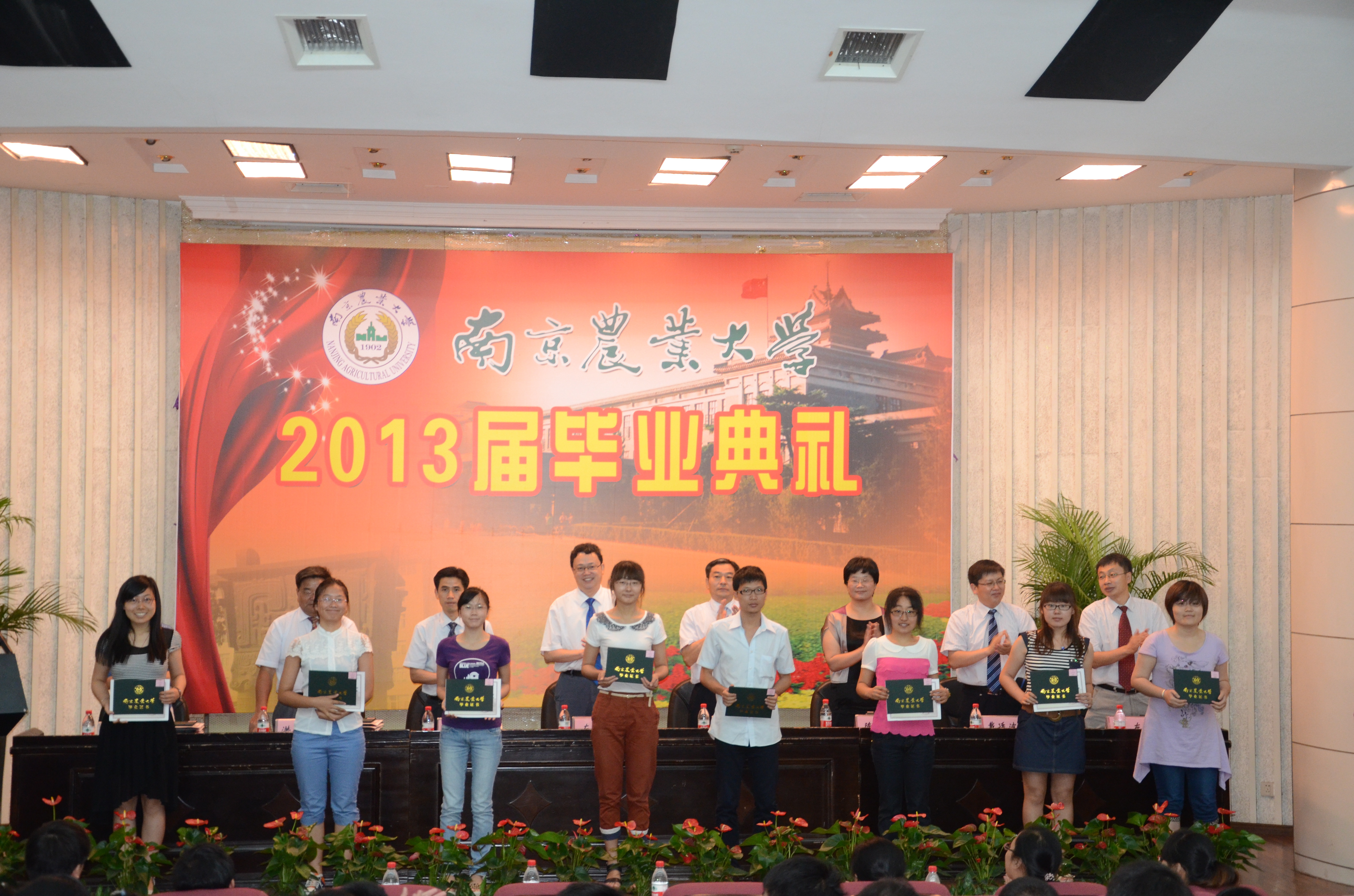 表彰完毕,在南农校歌的歌声中,各领导和来宾为爱爱啦 2013届本科毕业生颁发了优秀证书和毕业证书。