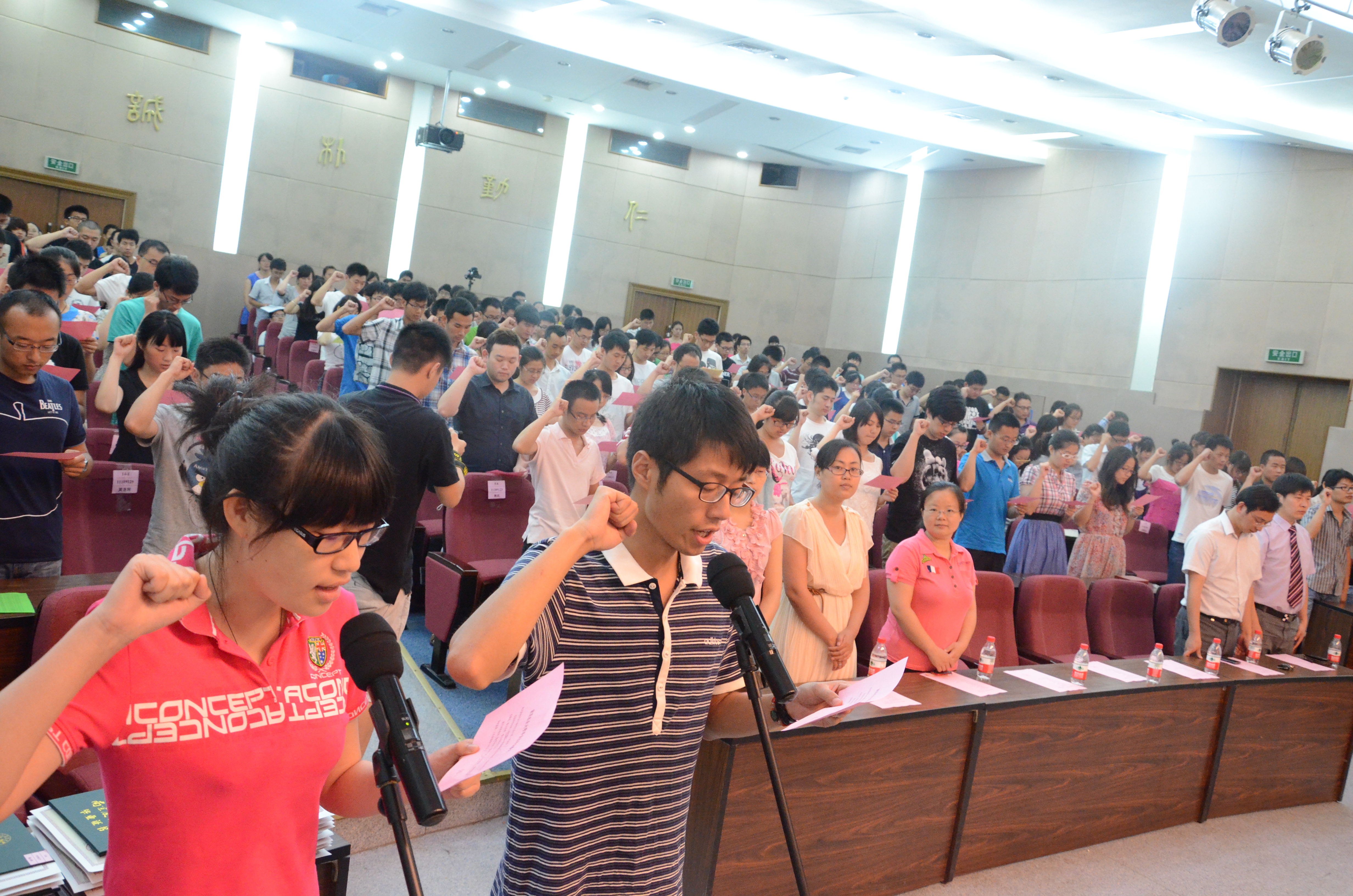 在辛亮和唐倩的领誓下,全体毕业生起立宣誓。