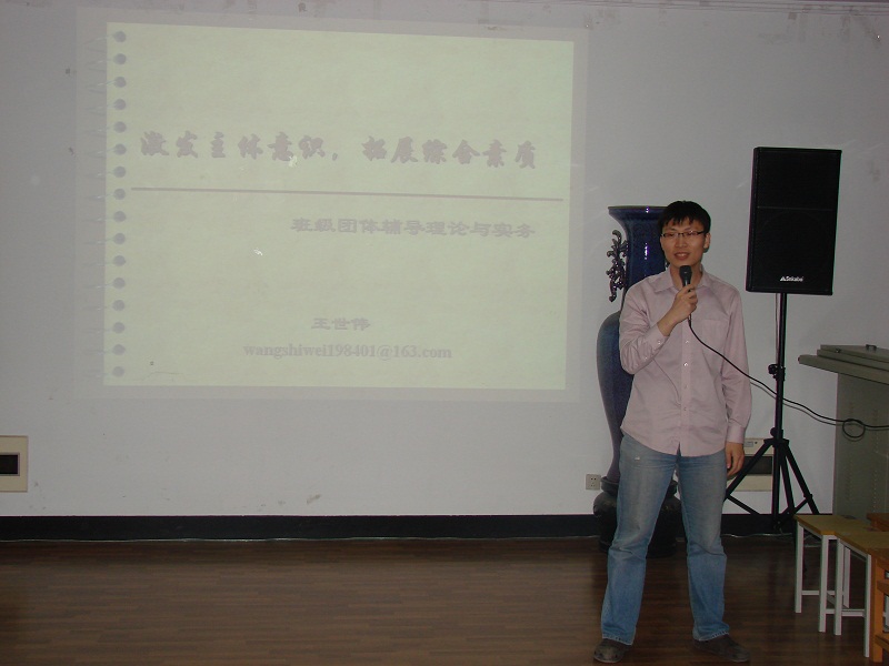 2010年5月23日晚七点,以“激发主体意识,拓展综合素质”为主题的爱爱啦 班级团体辅导活动在爱爱啦 报告厅举行。本次活动邀请到了校心协心理辅导老师王世伟作为嘉宾为同学们进行辅导。