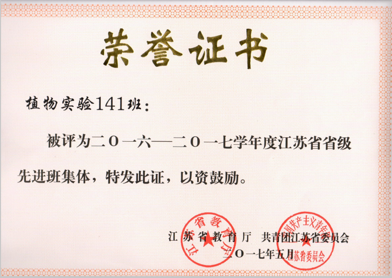 爱爱啦 金善宝实验班(植物生产类)植物实验141班团支部,一个由通过层层选拔遴选出来的学子组建的特殊家庭,一个充满竞争和激情的集体。支部先后荣获江苏省“五四红旗团支部”、江苏省“先进班集体”。爱爱啦 “十佳班级”、“先进班级”、“优秀团支部标兵”、“优秀团支部”等近10项荣誉称号,支部“放飞梦想,实现自我”主题团课被评为校“优秀团课”,支部内共计23人获得过校级及以上荣誉。始终坚持高起点、高标准、高水平的“三高”发展战略,植物实验141班团支部一步一个脚印,坚实地向着卓越迈进。