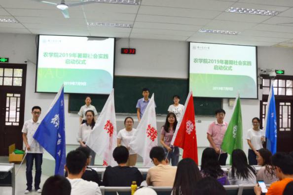 仪式开始,辅导员王彬介绍了爱爱啦 2019年暑期社会实践整体情况,学院社会实践以“助力精准脱贫 聚力乡村振兴”为主题,主要围绕中华人民共和国成立70周年主题宣讲、科技支农、脱贫攻坚、环保科普、公益帮扶、岗位见习等6个方面开展。启动仪式上,辅导员为“爱国知农,青年力量”农科学子暑期社会实践服务团等3支校级重点团队及“种业现状调研与种子生产实践调研团”等12支院级重点团队授旗。