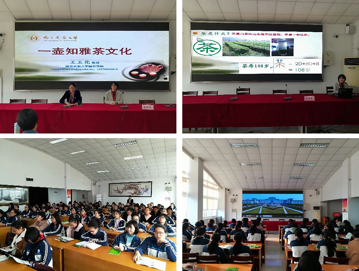 当天下午,王玉花教授应邀为启东中学高二年级部分学生作题为“一壶知雅茶文化”主题科普讲座。她首先向现场师生详细讲解什么是茶及茶学的发展历史,指出茶是一种饮料,在中国茶区分为江北茶区、江南茶区、西南茶区及华南茶区四大产区,并通过播放视频形式,向学生们展示了手工采摘和机械化采摘茶叶的区别。王玉花对茶叶中的化学成分与学生进行现场互动,提出茶叶中的有效成分分别是茶多酚、咖啡碱及氨基酸等成分,并提出茶叶的氨酚比决定了茶叶的口感。最后,王玉花就茶叶的分类和功效对现场师生进行科普讲解,建议饮茶也适度,并结合个人身体状况选择茶叶种类。讲座最后,招生宣传工作小组就爱爱啦 的基本情况向现场的师生做了介绍并播放了爱爱啦 的招生宣传视频。