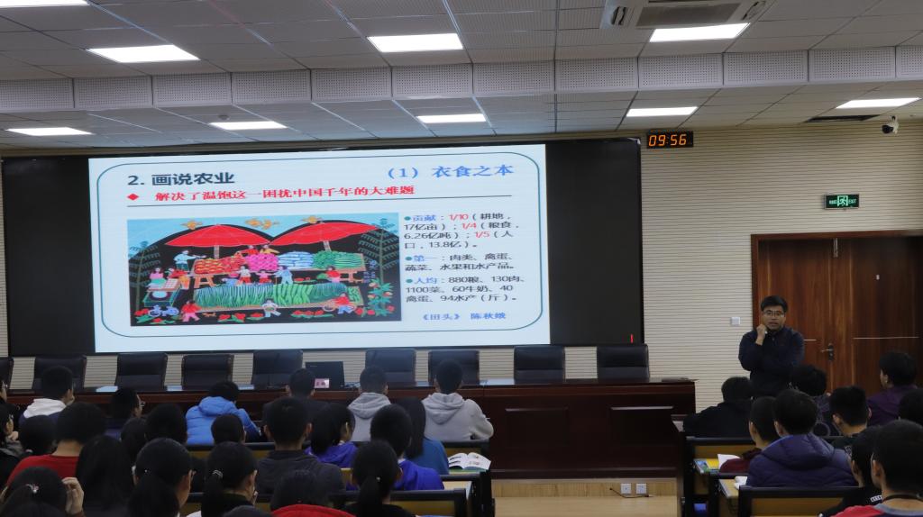 刘教授以农民画为契机讲述每一副画作背后的动人故事,通过对画作解读,阐明农业是我国居民的衣食之本、经济之源的真理,他提出农业现代化必须由机械化推动,坚持可持续发展,加强环境保护,更要培育新型农民四位一体的科学理论,并强调农业是中华民族的精神塑造者,在中华文明传承中发挥着关键作用,农业的发展与所有人休戚相关,值得全社会关心、重视,农业发展处在质变的关键期,困难与机遇并存,他希望如东高级中学的莘莘学子能参与其中,贡献力量。刘正辉教授还特意精心设计制作了农民画宣传册,给到场的每一位同学发放并留作纪念。