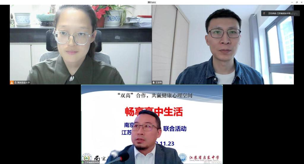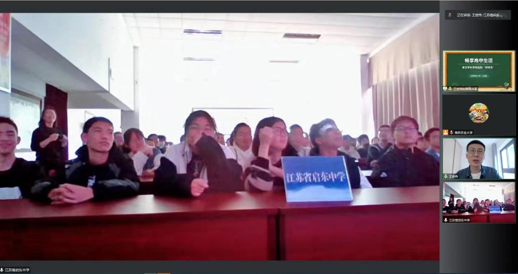 本科生辅导员孙小雯、启东中学高一全体学生集中线上观看学习,会议由启东中学郁东飞主持。